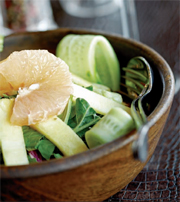Ananas ve greyfurtun kabuklarını soyup dilimleyin. Yeşilliklerin üzerine yerleştirin. Kiraz domateslerle süsleyip servis yapın.