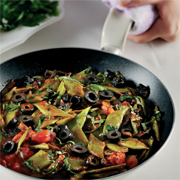 Domates soslu taze fasulye kavurması: Ayıklayıp yıkadığınız taze fasulyeyi tuzlu suda 10 dakika haşlayıp suyunu süzün. Tavaya zeytinyağı ve sarımsakları ekleyip kısık ateşte soteleyin. üzerine taze fasulyeleri ilave edip pişirmeye devam edin. Doğranmış domatesleri ve siyah zeytini ekleyip karıştırın. 1 çay bardağı sıcak su ilave edin. Tuz ve baharatları ekleyip kısık ateşte suyunu çekinceye kadar pişirin. Ocaktan almaya yakın doğradığınız fesleğenleri ekleyip karıştırın ve ocaktan alın. Servis yapın.